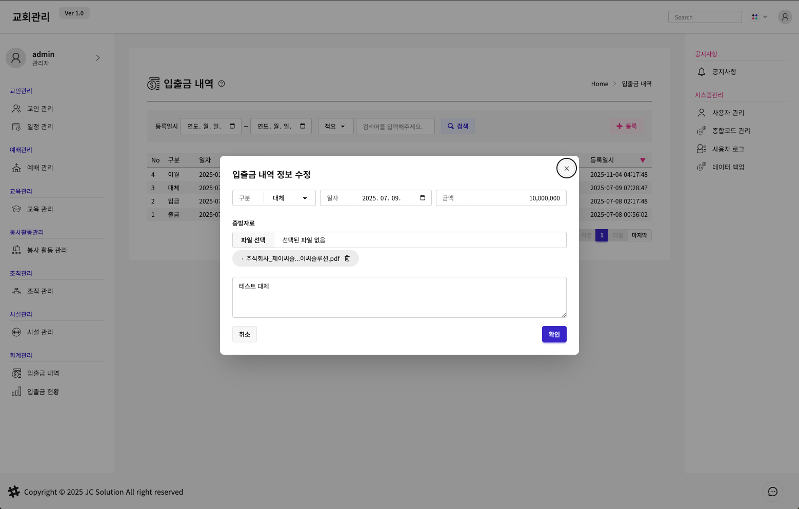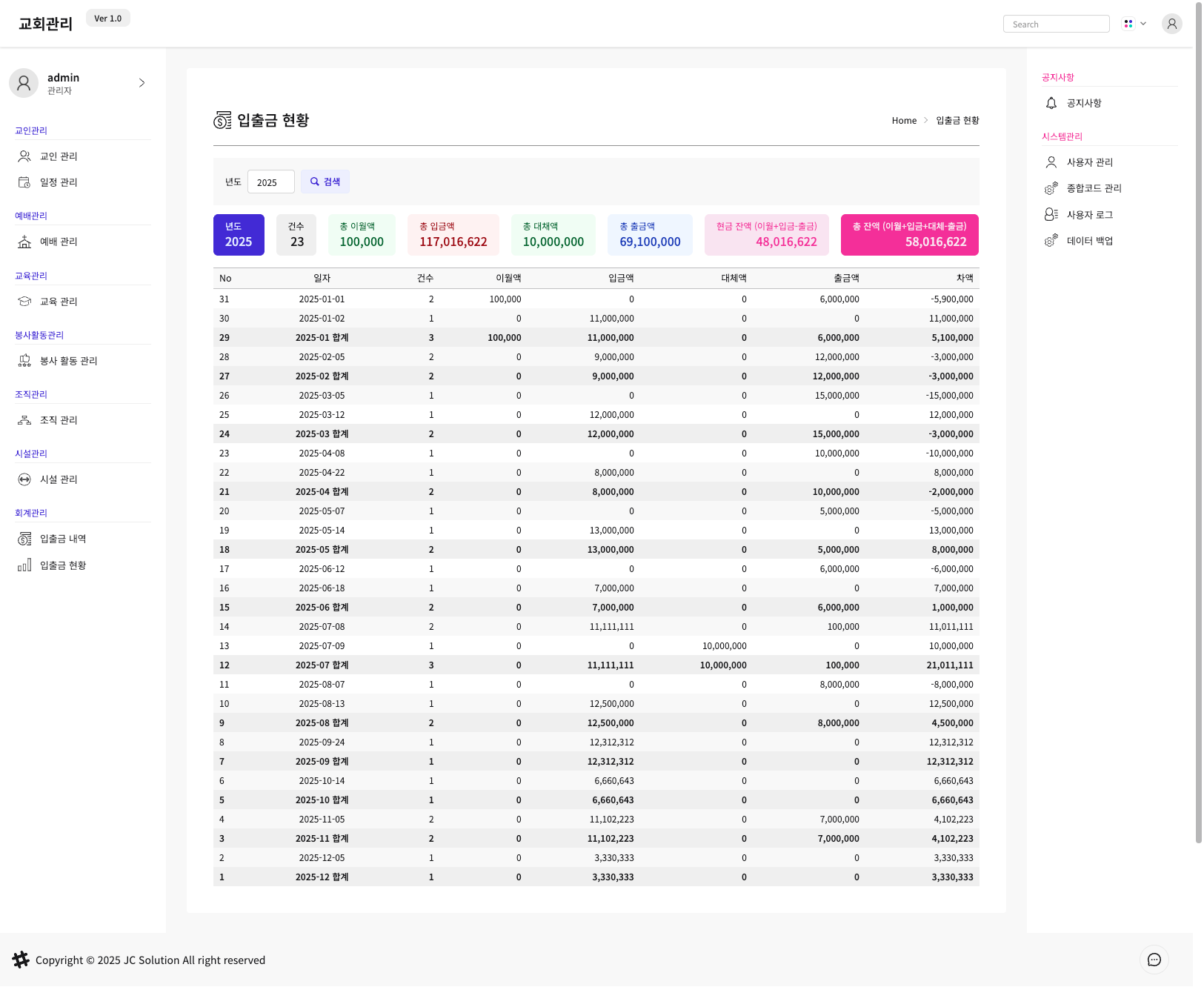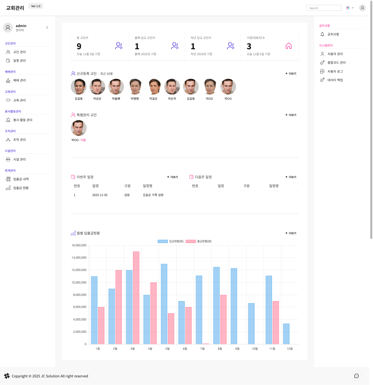 교인 관리, 일정 관리, 예배 관리, 교육 관리, 봉사 활동 관리, 조직 관리, 시설 관리, 입출금 내역, 입출금 현황
