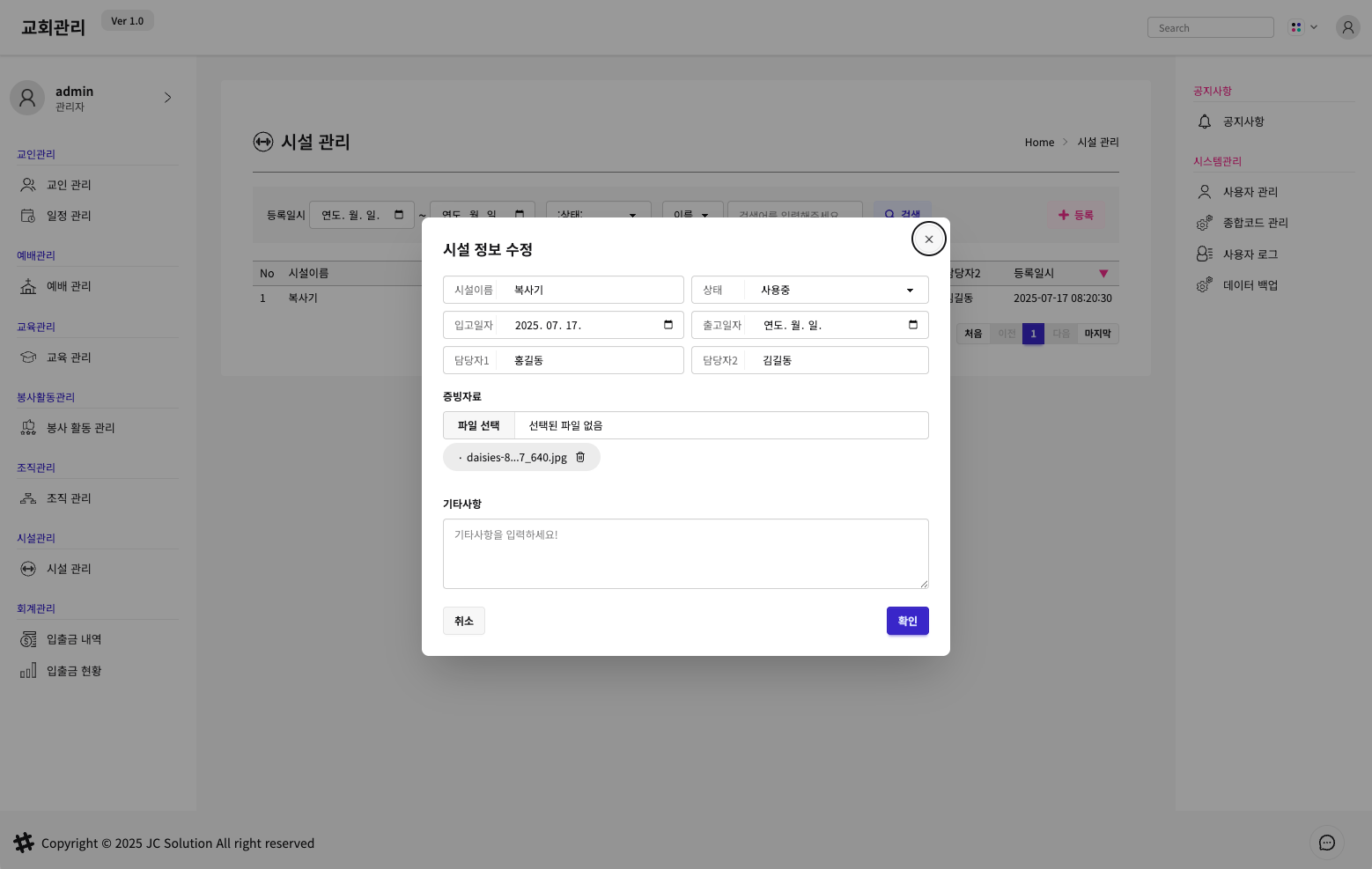 시설이름, 상태, 입고일자, 출고일자, 담당자1, 담당자2, 증빙자료, 기타사항